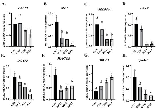 Effects of dietary replacement of soybean oil with rubber seed oil on hepatic lipid metabolism-related genes expression in Pekin ducks. Relative mRNA expressions of FABP1 (A), ME1 (B), SREBP1c (C), FASN (D), DGAT2 (E), HMGCR (F), ABCA1 (G), and apoA-I (H) genes normalized to β-actin, and expressed as a fold change in the control group. Different letters of a–d above bars mean statistically significant differences (p < 0.05) in different groups. Results are presented as means with plus error bars (n = 8).