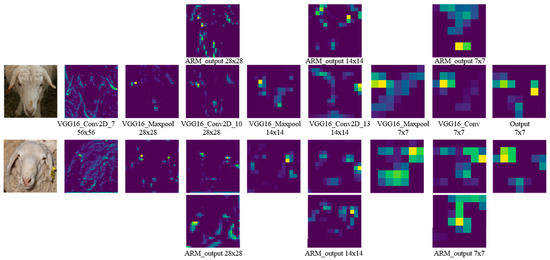 CNNs exhibit several advantageous qualities, including simplicity, scalability, and domain transferability [15]. In this paper, three different CNN architectures were used to classify images acquired in a realistic environment: VGG16, GoogLeNet, and ResNet50. Spatial information was extracted from individual sheep faces and used to construct a feature model. Figure 10 shows the results of feature classification produced by ResNet50, applied to the 8st image of the 8rd Dupo sheep, while Figure 11 shows the output of individual network layers applied to feature maps. It is evident from Figure 10 that highlighted areas were mainly concentrated along contours defining the eyes, ears, nose, and mouth. The distribution of information in these highlighted regions provides a foundation for achieving more accurate sheep face recognition. The proposed method also offers high generalizability and effectively captures facial expressions.