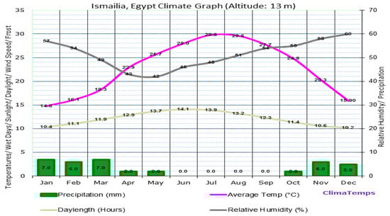 The climate graph of Ismailia Governorate, Egypt (http://www.cairo.climatemps.com, accessed on 1 December 2021).