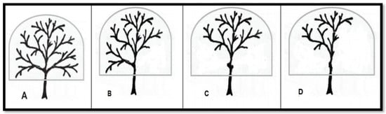 Tree forms used for pruning severity treatments. (A) Control; (B) light; (C) moderate and (D) heavy. The diagram sample of the tree (A) according to Cronje et al. [15].