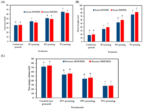 Effect of pruning severity on: (A) shoot length (cm), (B) leaf area (cm2) and (C) tree canopy volume (m3) of ‘Valencia’ orange trees during 2019/2020 and 2020/2021 seasons. The bars represent average values plus or minus the standard error (n = 12). Distinguishing letters above the columns indicate that there are significant differences between the pruning treatments at a significance level of p < 0.05 based on Bartlett’s test.