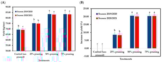 Effect of pruning severity on: (A) yield (kg/tree), and (B) increasing yield (%) of ‘Valencia’ orange trees during 2019/2020 and 2020/2021 seasons. The bars represent average values plus or minus the standard error (n = 12). Distinguishing letters above the columns indicate that there are significant differences between the pruning treatments at a significance level of p < 0.05 based on Bartlett’s test.