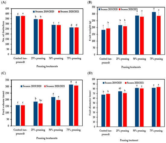 Effect of pruning severity on: (A) number of fruits/tree, (B) fruit weight (g), (C) fruit volume and (D) fruit diameter (mm) of ‘Valencia’ orange trees during 2019/2020 and 2020/2021 seasons. T1: control, T2: light pruning, T3: moderate pruning and T4: heavy pruning. The bars represent average values plus or minus the standard error (n = 12). Distinguishing letters above the columns indicate that there are significant differences between the pruning treatments at a significance level of p < 0.05 based on Bartlett’s test.