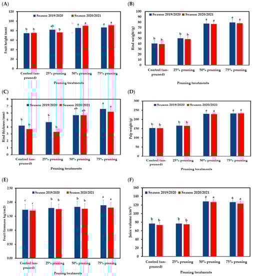 Effect of pruning severity on: (A) fruit height (mm), (B) rind weight (g), (C) rind thickness (mm), (D) pulp weight (g), (E) fruit firmness (kg/cm2) and (F) juice volume (cm3) of ‘Valencia’ orange trees during 2019/2020 and 2020/2021 seasons. T1: control, T2: light pruning, T3: moderate pruning and T4: heavy pruning. The bars represent average values plus or minus the standard error (n = 12). Distinguishing letters above the columns indicate that there are significant differences between the pruning treatments at a significance level of p < 0.05 based on Bartlett’s test.