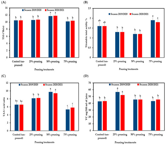 Effect of pruning severity on: (A) TSS (°Brix), (B) titratable total acidity (%) (C) TSS/acid ratio, (D) vitamin C of ‘Valencia’ orange trees during 2019/2020 and 2020/2021 seasons. T1: control, T2: light pruning, T3: moderate pruning and T4: heavy pruning. The bars represent average values plus or minus the standard error (n = 12). Distinguishing letters above the columns indicate that there are significant differences between the pruning treatments at a significance level of p < 0.05 based on Bartlett’s test.
