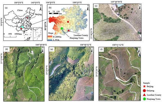 In this study, the total four sample sites are located in Huajiang town and Luodian County of southern Guizhou Province (Figure 1a,b). One of the sample sites is located in Huajiang town; it is named the Guanling Pitaya planting demonstration area (25°39′13″ N–25°41′00″ N, 105°36′30″ E–105°46′30″ E). Three of the sample sites are located in Luodian County; they are named the Sunshine Orchard (25°40′31.40″ N, 105°39′50.87″ E), the Xinzhongsheng Pitaya Planting Base (25°24′23″ N, 106°47′25.52″ E), and the Langdang Pitaya planting base (25°25′15.84″ N, 106°47′29.79″ E) (Figure 1c–f).