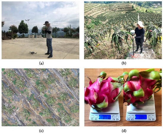 Figure 2. Pitaya data acquisition; (a) Data collection; (b) Data processing; (c) Pitaty images collected by UAV; (d) Manual measurement of yield data.