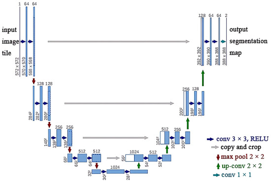 The U-Net network model is an important semantic segmentation method in deep learning methods; it is a new Fully Convolutional Networks (FCN) segmentation model proposed by Çiçek et al. (2016) [34]. In the U-Net network, the down sampling part consists of 5 nodes, and the up sampling part consists of 4 nodes. Each layer consists of a convolutional layer, a pooling layer, and an activation function; the down sampling convolves and pools the image to extract the image features, and the up sampling precisely locates the recognition target and recovers the image size. The U-Net network model is shown in Figure 6.