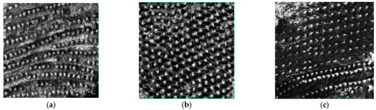 Using the band calculation tool of ENVI software [7,14,29,30], a remote sensing data processing platform, the similar color vegetation index model was used to calculate the CCVI (Close Color Vegetation Index) of the three sample plots (segment from Sunshine Orchard, Xinzhongsheng Pitaya Planting Base, and Langdang Pitaya planting base) containing Pitaya plants and weeds to obtain the color gray space, as shown in Figure 7a–c, for example.