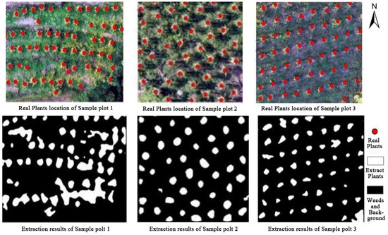 The grayscale spatial distribution of plants and weeds was obtained by grayscale density segmentation, and the maximum between-cluster variance method (OSTU method) [35] was used to binarize the grayscale of plants and weeds. Because the CCVI index was calculated in image elements, the binarization results showed some discontinuous fragmented patches and patch hollow phenomenon, and it used the processing methods of convolution filtering and cluster analysis to remove the fragmented patches and fill the patch hollow area. The three sample plots and the corresponding extraction results were obtained, as shown in Figure 8, for example.