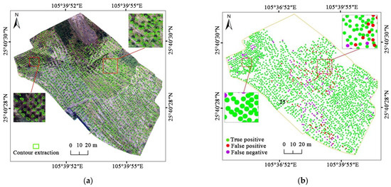 Comparing the actual number of plants and the number of extracted plants in the three sample plots, the over extraction 14 plants were extracted from Sunshine Orchard, the over extraction 5 plants were extracted from Xinzhongsheng, and 10 plants were missed from Langdang; the overall precision, detection rate, and accuracy rate were all greater than 90%, which met the general requirements of extraction precision.