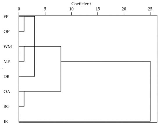 Figure 2 shows the cluster analysis of culturable bacterial bioaerosol concentrations in different regions. The results show that culturable bacterial bioaerosols on the interfield road were clustered into a single category; the background and office area were clustered into the same category; and the remaining five regions can be clustered into another category. When clustered into three categories, the remaining five regions can be further clustered into dairy barns and the other two categories. In cluster analysis, individuals clustered in the same category have great similarity. This indicates that there are similar characteristics of culturable bacterial bioaerosol concentrations for the different sampling regions clustered in the same category. Combined with the extreme difference and cluster analysis, it can be seen that the interfield road was the region most seriously contaminated by culturable bacterial bioaerosols on the farm, and it should be the priority area for daily disinfection. The interfield road is prone to turbulence due to the diffusion blockage of animal buildings. Moreover, dust raising would be caused by the daily activities of cows (e.g., migration for milking), vehicles (e.g., TMR truck, manure suction truck), and workers. This may be why the culturable bacterial bioaerosol concentrations showed different characteristics on the interfield road compared with the other regions. Thus, according to the cluster analysis and measured culturable bacterial bioaerosol concentrations on the dairy farm, the air contamination level would be IR > DB > WM ≈ MP ≈ OP ≈ FP > OA ≈ BG. This gives a reference for daily disinfection events on the dairy farm. However, this contamination gradient does not represent the emission level of culturable bacterial bioaerosols. The concentration would be highly affected by the air exchange rate and the ease of diffusivity in different emission scenarios, among other things. Even with a very high emission rate, the concentration can be very low when the air exchange rate is large enough.