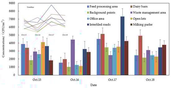 Daily variations in culturable bacterial bioaerosol concentration in different regions are shown in Figure 3. Overall, the daily concentrations in various regions exhibited a consistent variation pattern throughout the sampling period (15 October–18 October). There are large differences in the measured concentrations on different days in the same area. This may be because of the influence of environmental factors and the geomorphic complexity of the diffusion surface. The concentration of bioaerosols fluctuates throughout the day, even within the same day, as highlighted by Qian et al. [19]. This variability is primarily influenced by factors such as topography and environmental conditions. In their research, Sun et al. [20] found that atmospheric bacteria primarily originate from the ground, and their concentration significantly decreases with increasing altitude. This indicates a strong relationship between culturable bacterial bioaerosol concentration and topographical conditions. Ma et al. [21] discovered that the diurnal variation in bioaerosols is primarily governed by bacteria and exhibits a strong correlation with relative humidity (RH). Forde et al. [22] analyzed the emission characteristics and discussed the sources of fluorescent bioaerosols in winter and summer at four different locations in the United Kingdom. They found that bacteria were the predominant component, and that bacterial concentration exhibited a strong correlation with relative humidity (RH). Furthermore, in studies conducted by other researchers [23,24,25], it has been observed that various environmental factors have an impact on bioaerosol concentration, although the significance of their influence may vary. Therefore, in bioaerosol studies conducted on dairy farms, the influence of environmental factors on bioaerosols is indispensable.