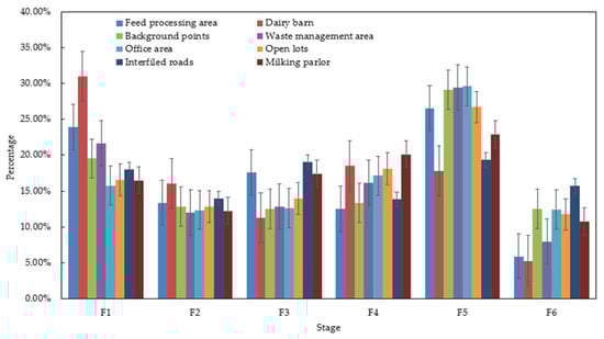 As shown in Figure 4, the size distribution of culturable bacterial bioaerosols in different regions generally followed the same variation pattern, except for the dairy barn and milking parlor. In the dairy barn and milking parlor, the different variations mainly occurred in the F3 and F4 stages (Figure 4). This may be because of the different environmental factors indoors and outdoors. Due to the influence of the envelope structure and animals on mass and heat transfer, indoor environmental factors such as RH and radiation significantly differ from those outdoors. Normally, RH indoors would be higher than RH outdoors. The rise in RH can promote an increase in aerosol particle size [28]. Similar size distributions were observed between the dairy barn and the milking parlor, as these two sites collected bioaerosol samples indoors. The rest of the area was sampled in the open air, and therefore maybe there are differences.