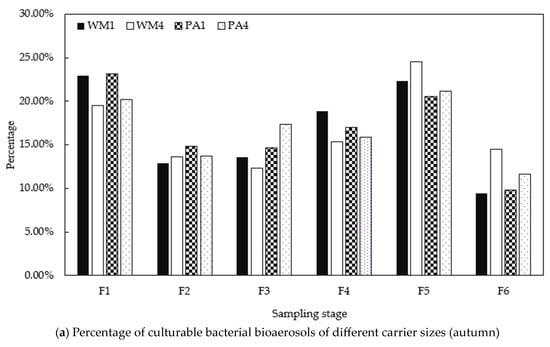 Proportion of culturable bacterial bioaerosols in different sizes (Data in (b) were from Ru et al. [29]). Note: The sampling area in autumn is the production area (PA) and waste management area (WM), and the sampling area in summer is the production area (PA) and farming area (FA). The sampling area is composed of the waste management area (WM) and production area 1 (PA) (depicted in Figure 1); WM1 represents 1 m of waste management area (similar hereinafter).