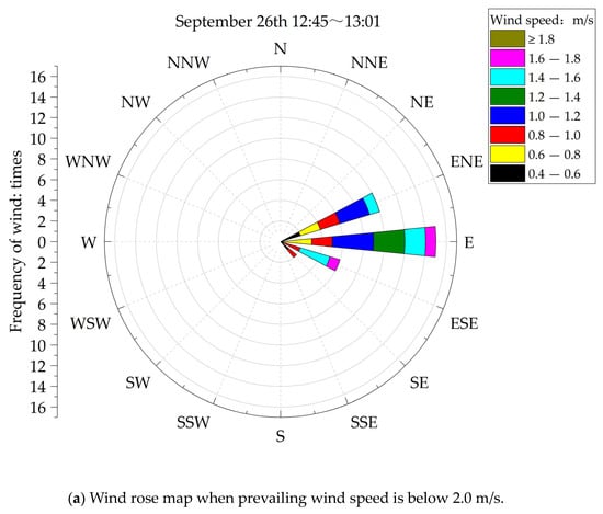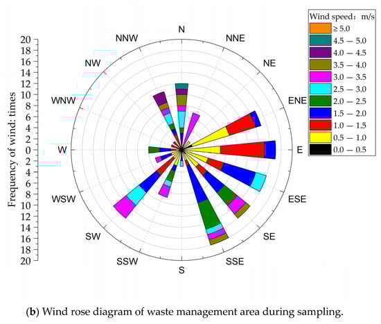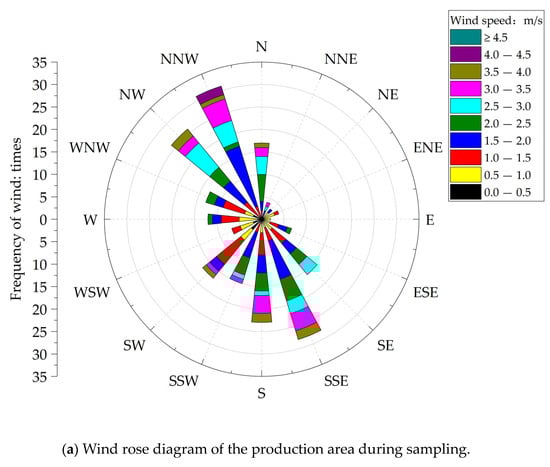 The measured environmental factors on the dairy farm in the field measurements are shown in Table 4. During the whole sampling period, the wind direction in the production area was predominantly northwest and southeast (Figure 8a). The wind speed was concentrated below 4.5 m/s, with an average wind speed of 2.76 m/s. Wind direction varied more frequently when bioaerosols were sampled in the waste management area (Figure 8b). The prevailing wind speed was close to that in the production area, with an average wind speed of 2.74 m/s.