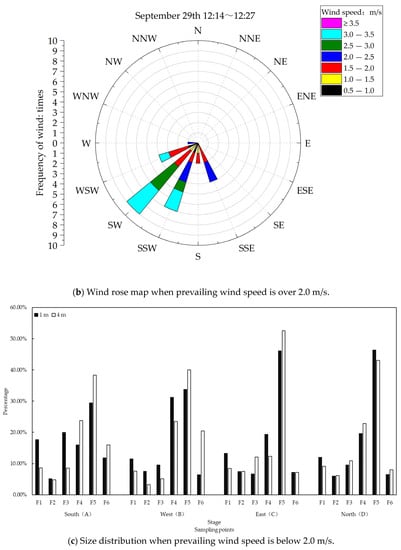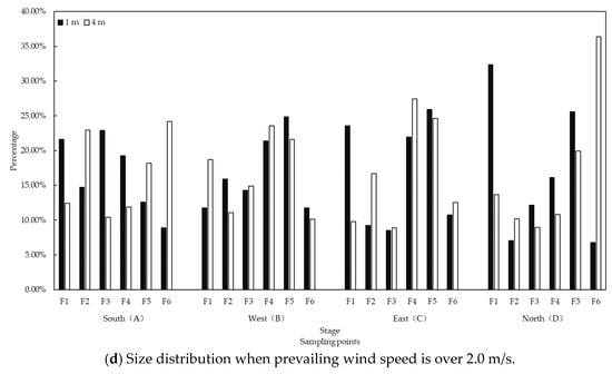 The shift of seasons is usually shown in the change of environmental parameters. Combined with the environmental factors of the experimental farm, it was found that the wind factor has a certain influence on the carrier size distribution of culturable bacterial bioaerosols. When the wind speed is slow, size distributions between different sampling locations or different heights were more stable. Again, take the waste management area as an example. When the maximum wind speed during sampling was below 1.8 m/s (Figure 6a), size distributions at different heights or in different locations followed similar variations, and culturable bacterial bioaerosols in the F5 stage (1.1–2.1 μm) had the highest proportion (Figure 6c). However, due to the wind speed during sampling increasing to about 2.5–3.5 m/s (Figure 6b), the size distribution at different heights or in different locations varied considerably (Figure 6d). In this case, the wind direction during sampling was mainly from the southwest. Size distributions differed at 1 m and 4 m in the south and north sampling locations due to the dust-raising effect of wind (Figure 6d). The higher the wind speed, the more seriously the size distribution was affected in the sampling locations up and down wind. This is consistent with the results in summer from the literature [29].