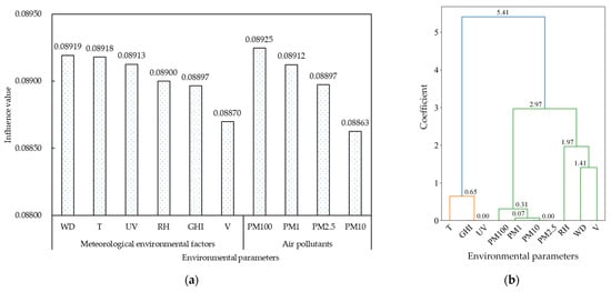 The influence of environmental factors on the culturable bacterial bioaerosol concentration and the results of hierarchical cluster analysis. (a) Sensitivity of culturable bacterial bioaerosol concentration on different environmental factors. (b) Results of hierarchical clustering analysis of environmental factors.