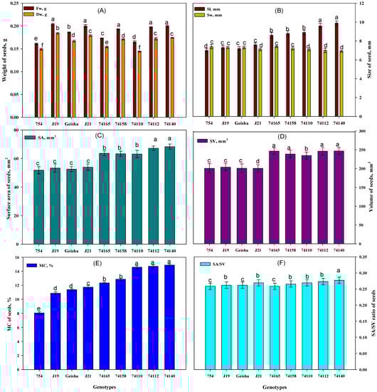 Pre-germination parameters of the seeds of nine C. arabica genotypes: (A) mean fresh (Fw) and dry (Dw) weight, (B) length (Sl) and width (Sw), (C) surface area (SA), (D) volume (SV), (E) moisture content (Mc), and (F) surface area to volume ratio (SA/SV). Bars indicate means ± SD, and the mean data are measurements of 60 representatives. Bars with the same letter indicates no significant difference at p < 0.05 between samples.