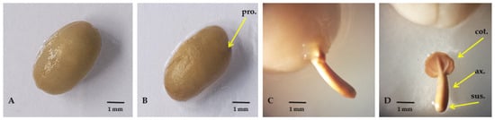 Photographs and micrographs of C. arabica germinating seed and embryo of relatively tolerant Ca74112 genotype: (A) seed during imbibition (bg-1), (B) imbibed seed with visible protuberance (pro.) (bg-2), (C) emergence of radicle from the outer layer of the endosperm (g), and (D) embryo with the cotyledons (cot.), the embryonic axis (ax.), and remnants of the suspensor (sus.) at the radicle tip (approximately 2–3.5 mm). Photos of (A,B) were taken using SonyAlphaA7RIV, and for (C,D), the observations were conducted under a Leica MZ8 microscope with a resolution power of 100 dpi.