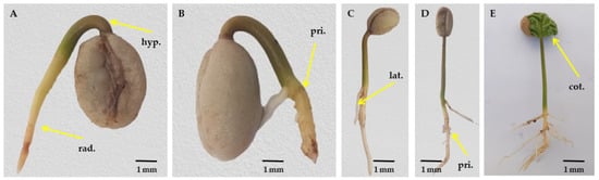 Photographs of post-germination stages of C. arabica development in chronological order of relatively tolerant Ca74112 genotype: (A) radicle (rad.) and hypocotyls (hyp.) emergence (sd-1), (B) root primordia (pri.) development between primary root and hypocotyls (sd-2), (C) lateral roots development (lat.) and appearance of root hairs on the primary root (sd-3), (D) properly developed primary (pri.) and lateral roots (sd-4), and (E) opening of cotyledonary (cot.) leaves (sd-5). Pictures were taken using SonyAlphaA7RIV.