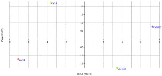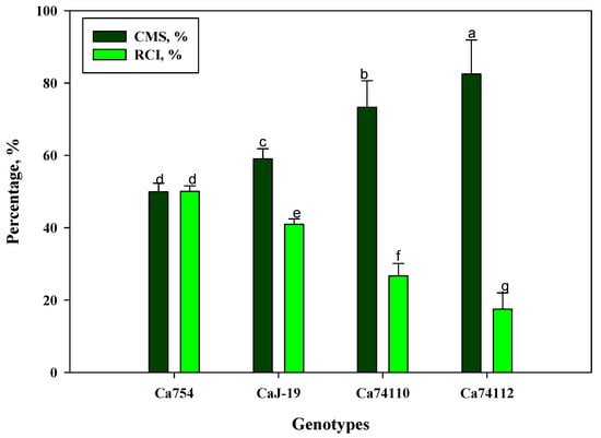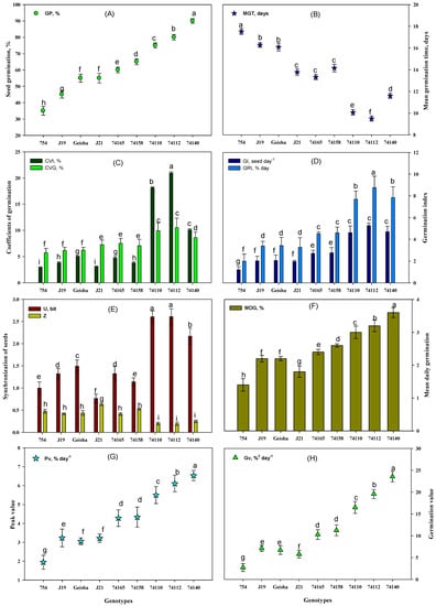Uncertainty of germination (U) indicates the degree of uncertainty associated with the distribution of relative frequency of germination [48], and synchrony of germination process (Z) describes the degree of overlapping of germination among seeds [49]. The highest U values were recorded in the relatively tolerant genotype Ca74110/Ca74112 (2.61 bit), whereas the lowest value was observed for the moderately sensitive genotype CaJ-21 (0.76 bit) (Figure 4E). The highest Z value was recorded in the moderately sensitive genotype CaJ-21 (0.64) and the lowest for the relatively tolerant genotype Ca74112 (0.19) (Figure 4E). The mean daily germination (MDG) percent represents the mean number of seeds germinated per day [50]. The MDG of the relatively tolerant genotype Ca74140 exhibited the highest (3.60%) and sensitive genotype Ca754 showed the lowest value (1.40%) (Figure 4F). The peak value (Pv) of germination is the accumulated number of seeds germinated at the point on the germination curve at which the rate of germination starts to decrease [50], and germination value (Gv) is the combination of speed and completeness of germination [51]. The relatively tolerant genotype Ca74140 exhibited the highest Pv and Gv (6.54% day−1 and 23.54%2 day−1, respectively) and sensitive genotype Ca754 showed the lowest Pv and Gv values (1.94% day−1 and 2.72%2 day−1, respectively) (Figure 4G).