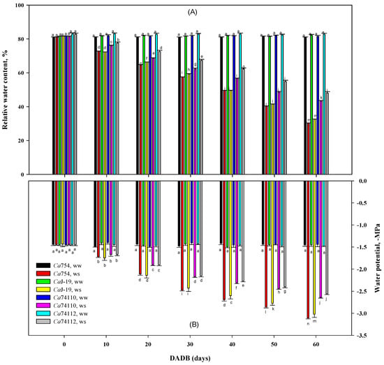The stem water potential (Ψw) was measured, at 9:00–11:00 a.m., using a Scholander pressure chamber (Soil Moisture Equipment Corp., Santa Barbara, CA, USA), at 10 days intervals till the end of the experiment (for around 60 days). Due to the small size of the leaf petioles, only the stem water potential of each genotype was measured. The stems were excised using a sharp blade and placed into the pressure chamber. The chamber was pressurized using a nitrogen tank, and Ψw was recorded when the initial xylem sap was emerging from the cut end of the stem.