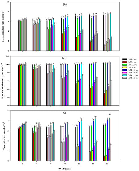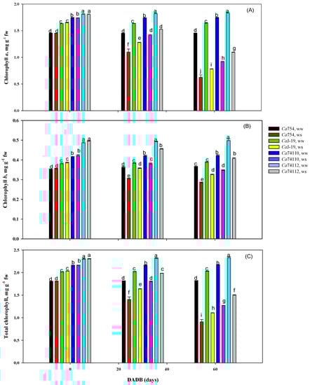 Following the protocols of Lichtenthaler [56], for the analysis of pigment (chlorophylls), healthy and fully expanded leaf discs from the same leaves used for gas exchange measurements were collected and analyzed from the genotypes, at 0, 30, and 60 days after the start of drought treatment.
