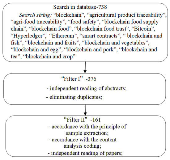 Paper collection: Google Scholar is the most famous English search engine, and Baidu Scholar is the most famous Chinese search engine. Therefore, Google Scholar and Baidu Scholar are used as search engines for the initial paper screening. On the other hand, the Chinese database, CNKI (https://www.cnki.net/) (accessed on 24 August 2023), and English databases, such as Web of Science and IEEE Xplore, are adopted for further paper screening to discover more related papers. Through the search results, we find that the volume of the research papers is large. Due to the limited ability of manual analysis, according to Bradford’s paper dispersion rule, most of the key papers are usually published in a few core journals. Therefore, Chinese papers are mainly limited to the papers in the Chinese Social Sciences Citation Index (CSSCI) journals and Chinese core journals. There are a large number of English papers in this field, and the representative important journals and conferences in the field of blockchain technology mainly include: IEEE International Conference on Blockchain (Blockchain); International Conference on Mainstreaming Blockchain Implementation (ICOMBI); International Conference on Big Data and Blockchain; International Conference on Computer Science and Its Application in Agriculture (ICOSICA); International Conference on Computer Engineering, Information Science and Application Technology; IEEE International Conference on Blockchain and Cryptocurrency (ICBC); International Conference on Global Security, Safety and Sustainability (ICGS3); Crypto; IACR Eurocrypto; USENIX Security; IEEE Access; Journal of the Science of Food and Agriculture; The Journal of the British Blockchain Association; Sustainability; Food Control; Future Generation Computer Systems; Artificial Intelligence in Agriculture; Future Generation Computer Systems; International Journal of Information Management and so on.