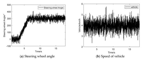 Test method: The yaw force algorithm of sliding mode control and the yaw moment algorithm of PID control are compiled and downloaded into the vehicle controller, and the torque distribution is optimized. Considering the safety of the test, the accelerator pedal is pressed slowly first, and the test speed is maintained at about 4 km/h. When the steering wheel starts to turn at 3 s, the steering wheel angle quickly reaches the maximum at 6 s. At the same time, the steering wheel angle, speed, expected yaw speed, actual yaw speed, and wheel torque signal are recorded in Figure 10 and Figure 11, showing the data acquisition results of real vehicle tests. A second-order Butterworth low-pass filter with a cut-off frequency of 20 Hz is used to filter high-frequency pulse signals to obtain the test data of the electric tractor.