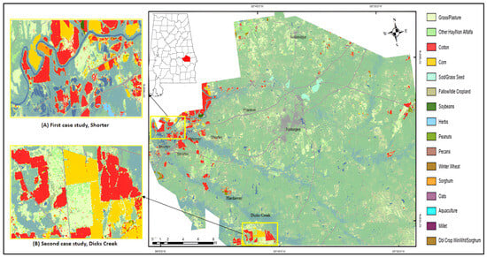 This study looks at Macon County, Alabama, for several reasons. Firstly, it is a mostly rural area that relies heavily on agriculture and livestock farming. Secondly, it accounted for 1% of all pesticide use in the state of Alabama in 2017. Lastly, it ranks 16th in agricultural products and 17th in vegetables statewide [33]. Macon County is located in east-central Alabama, between latitudes 32°7′49″ and 32°35′7″ N and longitudes 85°30′48″ and 86°1′19″ W. It covers a total area of 392,830 acres, which includes water bodies, equivalent to 650 square miles. The county is bordered by Tallapoosa County to the north, Bullock County to the south, Russell County to the east, and Montgomery County to the west. Tuskegee is the county seat and largest city with a population of 9395, while smaller communities like Notasulga, Franklin, and Shorter have populations of 939, 598, and 385, respectively. Approximately 23% of Macon County’s land area, or 53,001.1 acres, is dedicated to cropland [56,57]. Cotton is the largest crop, covering 8909.6 acres, or 16.81% of the total cropland. Corn is the second-largest crop, covering 1941.3 acres, or 3.66% of the total cropland. This study will focus on the two largest fields of cotton and corn crops, located in Shorter to the west and Dicks Creek to the south, respectively (Figure 1).