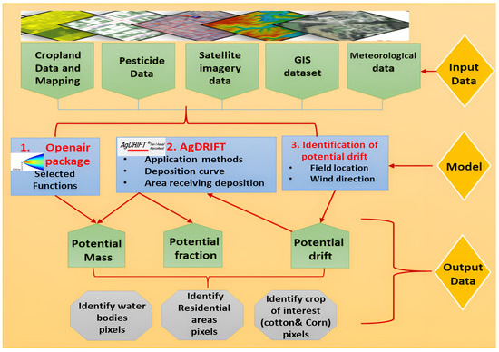 Pesticides have been widely used in agriculture, resulting in significant pollution that affects both the environment and human health. This pollution is particularly prevalent in nearby agricultural areas, where sensitive resources are contaminated through spray drift exposure and surface runoff. Spray drift is a critical concern when it comes to environmental hazards. It poses health risks not only to farmers and pesticide applicators, but also to individuals living in nearby farm areas. To address this issue, developing reliable models and techniques for estimating spray drift and reducing its impact has become a crucial and efficient research topic. The current research has three primary objectives: firstly, to estimate the average pesticide application rates, trend analysis, and concentration distribution; secondly, to estimate the temporal variations of pesticide concentrations and identify the areas most likely to be affected by pesticide spray drift close to agricultural fields; and lastly, to develop a model for field spray drift and deposition integration between the OpenAir package for the R programming environment and the AgDRIFT atmospheric model. The drift model, along with precise supervised classifications, allowed for a more accurate estimation of potential drift in agricultural areas at a spatial resolution of 15 m. Additionally, multiple scenarios were conducted to evaluate the potential risks of pesticide drift outside of the target areas. This novel method effectively estimated organophosphate pesticide spray drift over two case studies in Macon County using a combination of OpenAir and AgDRIFT models and remotely sensed data. This method allowed for field simulations within completely defined exposure areas with little prior knowledge of pesticide quantities. This study concluded that 6% of total cropland is in danger of pesticide spray drift, with around 8% of crop areas exposed to potential strong drift on land use. Furthermore, 11% of cropped land is vulnerable to moderate drift, whereas around 75% of land use land cover is not vulnerable to pesticide drift. Through this research, an accurate and efficient approach has been developed to estimate spray drift and reduce its impact in agricultural areas, contributing to a safer and healthier environment for all.