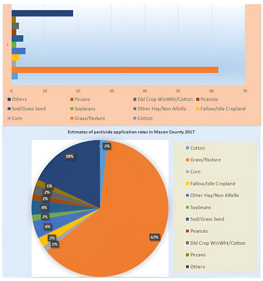Figure 4. Estimates of average pesticide application rates for the major crops (3744 kg of AIs/ha/year) and distribution (pie chart) of the agricultural surface of specific crops in Macon County, 2017.