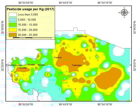 The data displayed in Figure 3 show the quantity of pesticides used on crops in Macon County according to the [58,59,60,61] USGS 2017 EPest-high estimations. The harvested farmland in this area had a rate of 199.61 pounds per square mile, and the total estimated pesticide usage for Macon County was 3721.6 kg, according to Table 1. The figure demonstrates that Tuskegee, Notasulga, Franklin, Woodland, and Shorter have a high pesticide usage rate, despite having a combined usage of over 32,000 kg of agricultural pesticides. However, it is important to note that this classification may not be well understood due to the uneven knowledge distribution of pesticides over time and space, especially in residential areas. Additionally, Figure 5 highlights the significant amount of vegetation that separates these cities from the issue.