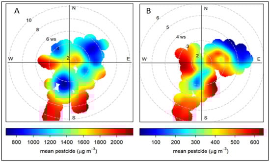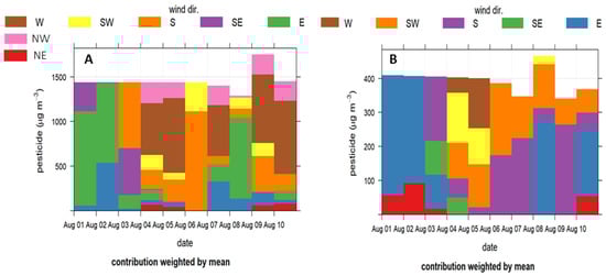 In Figure 10A, it is evident that the east and south-westerly winds have a significant impact on the average concentration of organophosphate pesticides in the Shorter field. Half of the total concentration is attributed to three wind sectors in the east, south, and west. On the other hand, Figure 10B highlights the dominance of east and south winds in determining the average concentration of organophosphate pesticides in the Spring Union field. More than half of the total concentration is contributed by two wind sectors in the east and south sections.