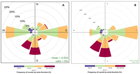 Figure 9. Prevailing wind speed and direction during the application day over Shorter (A) and Spring Union (B) based on wind speed/direction frequencies.