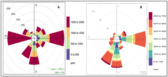 Moreover, the pollution rose is a useful tool to measure pollutant concentrations based on wind direction. It calculates the percentage of time the concentration is in a specific range. This approach is particularly informative for air pollution species, as demonstrated by [47]. In this study, it is used to measure pesticide gases released during a ground boom or aerial application.