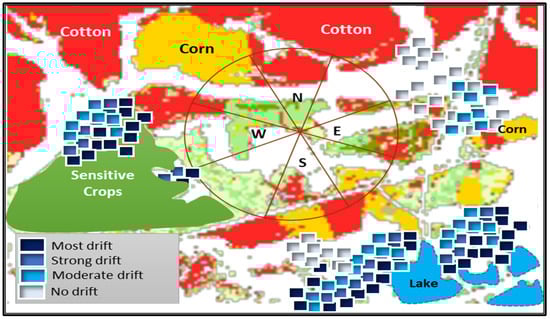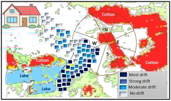 To determine the total potential drift exposure for a residential area, water bodies, and sensitive crops, the average of the AgDRIFT values was used for the main LULCs in eight directions. Table 4 and Table 5 were considered, and assuming that wind speeds varied between 4 and 10 mph throughout the experiment, we calculated the average potential exposure drift to the nearby residential and sensitive crop areas as well as the nearby water bodies as the total drift from all directions, divided by the eight main and secondary wind directions. We identified each non-target zone, particularly the sensitive resources pixel, in all eight directions (N, NE, E, SE, S, SW, W, and NW), which enabled us to estimate the potential spray drift dependent on wind direction. We estimated the potential drift exposure onto the nearby residential area, water bodies, and sensitive crops using eight directions.