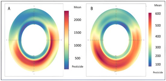 Figure 8. Identification of potential distribution for organophosphate pesticide concentrations over Shorter (A) and Spring Union (B).