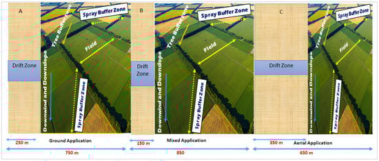 It is important to note that the study’s results were based on the standard buffer zone distances outlined in a drift model guide, as well as previous research on calculating potential pesticide drift exposure. This includes studies by Wan (2015), Mayer (2019), and El Afandi (2023) [11,31,33], respectively.