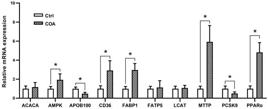 The relative mRNA expression of genes regulating the liver lipid metabolism of broiler chickens was presented in Figure 1, including acetyl-CoA carboxylase alpha (ACACA), protein kinase AMP-activated catalytic subunit alpha 1 (AMPK), apolipoprotein B (APOB100), CD36 molecule (CD36), fatty acid binding protein 1(FABP1), solute carrier family 27 member 5 (FATP5), lecithin-cholesterol acyltransferase (LCAT), microsomal triglyceride transfer protein (MTTP), proprotein convertase subtilisin/kexin type 9 (PCSK9) and peroxisome proliferator activated receptor alpha (PPARα). The expression of the housekeeping gene GAPDH was no different between the samples. The expressions of AMPK, CD36, FABP1, MTTP and PPARα were observably (p < 0.05) increased in the COA compared to the Ctrl. The liver of broiler chickens in the COA showed lower (p < 0.05) expressions of APOB100 and PCSK9 than those in the Ctrl. No difference between the two groups was found for the expressions of ACACA, FATP5 and LCAT in the liver of broiler chickens.