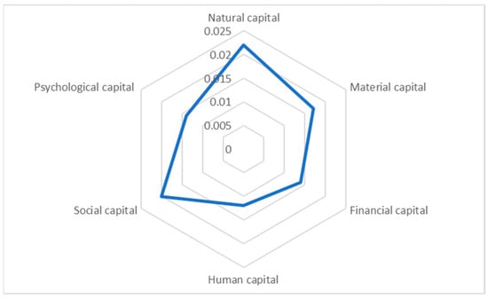 The weight distribution of the first-level indicators shows that the weight of these indicators of livelihood capital varies considerably (Table 2), the weight order is as follows: Financial capital (0.413) > Social capital (0.214) > Human capital (0.109) > Material capital (0.102) > Natural capital (0.098) > Psychological capital (0.063), indicating that the financial capital data has the largest difference, followed by social capital, human capital, material capital, natural capital, and psychological capital data. Compared with secondary indicators, the weight of financial products is the most important indicator, not only among financial capital indicators but for the indicators overall. Financial products are affected by rural households’ economic level and risk resistance capability, so rural households’ financial capital stock is quite different from other households. The value of external economic support and the status of participation in social organizations are the two most important social capital indicators, indicating that giving rural households external economic support and encouraging them to participate in cooperative organizations can effectively improve their livelihood capital. The weight of life satisfaction and degree of future expectation in psychological capital are low, showing that rural households’ life satisfaction and future expectations are not significantly different from other individuals.