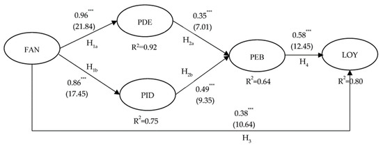 Among the observed variables in the PEB, PEB1 (0.97) has the highest factor loading, indicating that tourists enjoy participating in organic agricultural tourism experiences greatly, which plays a crucial role in fostering pro-environmental behavior within the destination. Similarly, within the LOY dimension, LOY3 (0.97) demonstrates the highest factor loading, suggesting that tourists’ engagement in activities related to organic agricultural tourism is a significant influencing factor for their loyalty towards the destination. In essence, the findings indicate that tourists who actively partake in organic agricultural tourism experiences are more likely to exhibit both pro-environmental behavior and loyalty. As mentioned in the studies by Lee [85] and Shen, Wang, and Loverio [21], an increase in place dependence is associated with a rise in responsible environmental behavior among tourists, and it also manifests their concern and attention towards environmental protection.