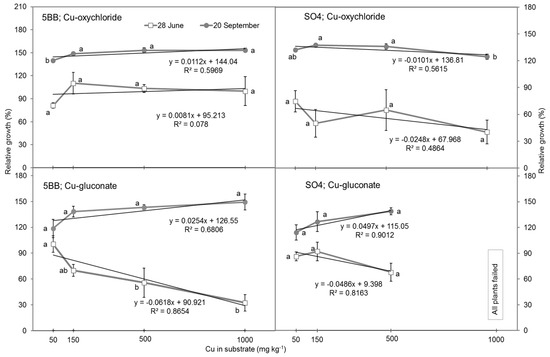 At the last shoot length measurement (20 September) (Figure 1; lines with circles), the increasing trend in the relative shoot length with the increase in Cu concentration in the substrate was confirmed, except for the SO4 rootstock (Cu-oxychloride), which was declining (Figure 1; right upper box). For the Cu-gluconate treatments, the differences between Cu concentrations were not significant (Figure 1; all data on lines marked with the same letter). The shoot length of the control plants without added Cu in the substrate were the lowest at the end of experiment.