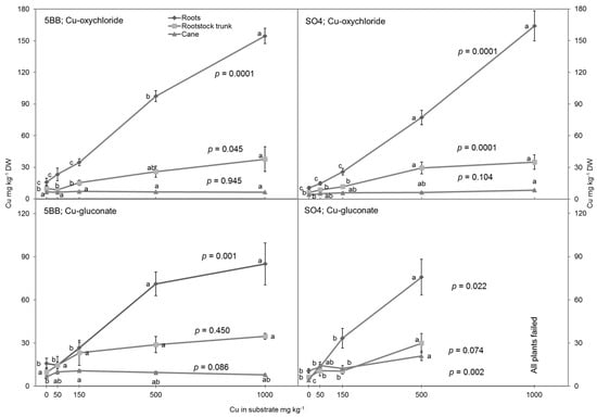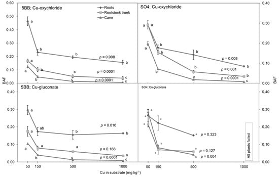 Bioaccumulation factors (BAF) for roots, rootstock trunk, and canes of grapevine grafts of Sauvignon Blanc grafted on 5BB and SO4 rootstocks grown in pots in response to treatment with a range of internal Cu concentrations (mg kg−1) in substrate. Different letters indicate significant differences between the BAF values in specific tissues (root, rootstock trunk, cane) and in specific combinations of type of rootstock and Cu formulation at p ≤ 0.05, according to the LSD tests. Values represent mean ± SE, n = 4.