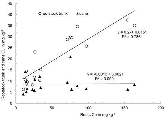 Correlations between Cu concentration (mg kg−1) in roots and in the rootstock trunk and canes of Sauvignon Blanc grafts exposed to various Cu concentrations and formulations in the substrate (p ≤ 0.05).