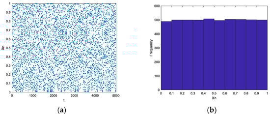 Population initialization for the tent chaos mapping: (a) scatter plot and (b) frequency distribution histogram.