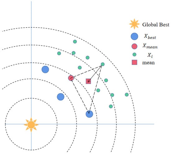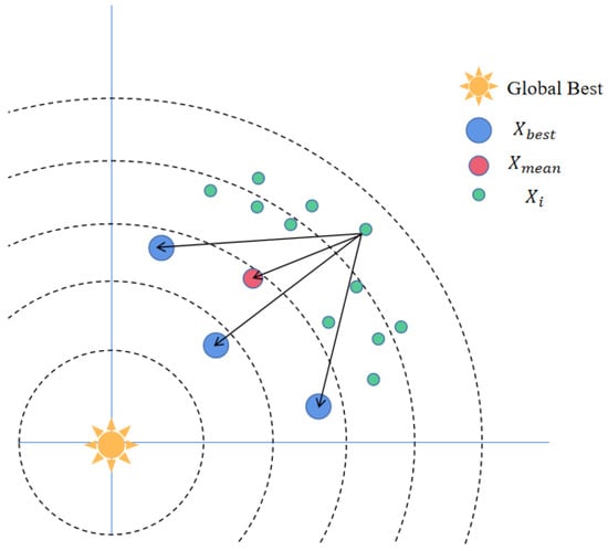 where , , and are the top three individuals with the best fitness value of the current population, respectively; denotes the weighted average position of the rolling dung beetles; is the population size; is the position of the th rolling dung beetle in generation ; and denotes the weighting coefficients among the rolling dung beetles in descending order of fitness value.