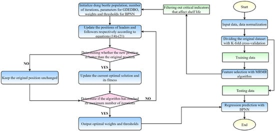 - Forecasting model and evaluation of results: The MRMR-GDEDBO-BPNN model predicted the shelf life of blueberries, using the physicochemical and quality indicators selected by the MRMR algorithm as input parameters and selecting different evaluation indicators to evaluate the prediction results. Figure 4 shows the flow chart of the MRMR-GDEDBO-BPNN model.