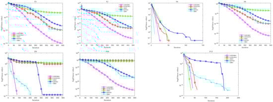 In order to fully verify the superior performance of the GDEDBO algorithm, this paper selects 14 standard test functions from the IEEE CEC2017 single-objective test function set to test the performance of the algorithm. As shown in Table 3, F1–F8 belong to unimodal test functions, which are used to check the convergence accuracy of the algorithm; F9–F14 belong to multimodal test functions, which are used to test the ability of the algorithm to jump out of the local optimum. The hybrid firefly and particle swarm optimization (HFPSO) [18], the gray wolf optimization algorithm with a hybrid Gaussian distribution estimation strategy (GEDGWO) [19], the Harris Hawk optimization algorithm (HHO) [20], and the original DBO algorithm were also selected as comparison algorithms, with their parameter settings referring to the original literature, as shown in Table 4. HFPSO is an improved particle swarm algorithm with a hybrid firefly algorithm. GEDGWO is a variant of the GWO algorithm incorporating a distribution estimation algorithm. Both of these improved algorithms have demonstrated good performance in their respective literature, while HHO and DBO are the latest proposed swarm intelligence optimization algorithms that have performed well in recent years and have been applied in different disciplines and engineering fields. Therefore, a comparison using these algorithms can improve the validity of the improvement strategies proposed in this paper. To ensure fairness, the number of populations N = 50, dimension D = 30, and the maximum number of iterations were set uniformly at 500. Each algorithm was run 50 times independently, and the optimal value, mean, and standard deviation of the fitness were recorded to evaluate the exploration performance, convergence accuracy, and stability of the algorithms. The experiments were implemented using MATLAB 2022b on a Windows 11, 64 bit system with an Intel® Core™ i7-11700 2.5 GHz, 16 GB RAM computer. The experimental results are shown in Table 5.